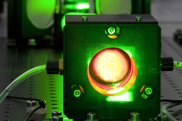 諧振器的鏡子捕獲這種光,使其在晶體中來回反射,不斷激發更多的發射和放大。其中一個鏡子是部分透明的,允許一些光作為輸出激光束逸出。